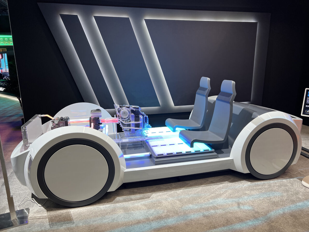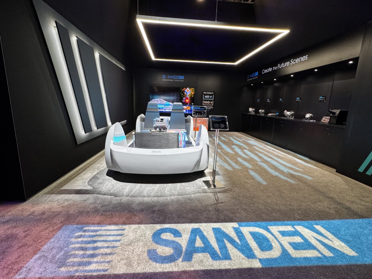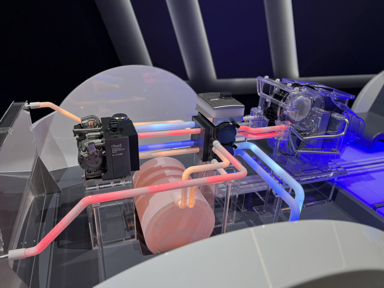 The main display was a mockup of our core technology, “Integrated Thermal Management System (ITMS) 3.0,” which was unveiled for the first time at CES. The ITMS was installed on a platform in the shape of an actual car-sized vehicle, and some parts, such as the HVAC, were made transparent in order to visualize the system’s operation. By showing changes in the temperature of the motor and battery with a change in the color of the electric lights, our display provided an intuitive understanding of the heat recovery process inside the vehicle and the generation mechanism of warm and cold air.